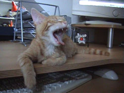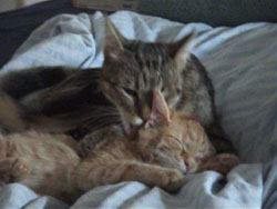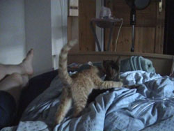 Ich bin auch eine nachtaktive Mietze und dann spiel ich immer mit den Füßen unserer Futtergeber während sie schlafen – das ist lustig! In der Früh hab ich dann natürlich Hunger vom vielen herumtollen in der Nacht – also muss um 6 Uhr früh mein Futter her – koste es was es wolle! Ich springe, kratze und beiße dann so lange auf unseren Futtergebern herum bis sie endlich aufstehen und mir mein wohlverdientes Futter auf dem Tablett servieren! Die Luna unterstützt mich da immer mit vollem Tatendrang. Gott sei dank – alleine würde ich die ja nie aus dem Bett kriegen! |