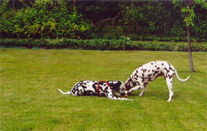 | Schöne Pleite! Na jedenfalls war im Garten ganz viel Lärm und außerdem das Gebelle von den zwei Wauwaus die von Deutschland angereist kamen mit diesen Zweibeinern. Ich glaub das waren die Schwester und der Schwager vom Frauchen. Gegen die Zweibeiner hab ich ja auch gar nix, aber müssen die denn unbedingt zwei Dalmatiner anschleppen! | ![]() |